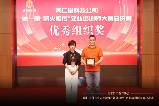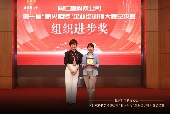 北京职工教育协会秘书长龙奕汐为北京同仁堂科技发展股份有限公司营销分公司颁发优秀组织奖