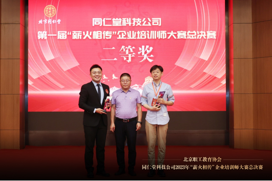 北京同仁堂科技发展股份有限公司党委副书记、工会主席姜晓东为二等奖获得者颁奖