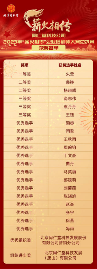 经过紧张的角逐,最终,来自北京同仁堂科技发展股份有限公司售后服务监察部的朱莹获得一等奖;来自北京同仁堂科技发展股份有限公司刘家窑分厂技术科的杨晓腾和北京同仁堂科技发展股份有限公司物流配送中心综合办公室的裴铮获得二等奖;来自北京同仁堂科技发展股份有限公司人力资源部的王钰、北京同仁堂科技发展(唐山)有限公司技术部的袁丹丹和北京同仁堂科技发展股份有限公司营销分公司新品商务部的尚志伟获得三等奖;北京同仁堂科技发展股份有限公司营销分公司获得优秀组织奖;北京同仁堂科技发展(唐山)有限公司获得组织进步奖。
