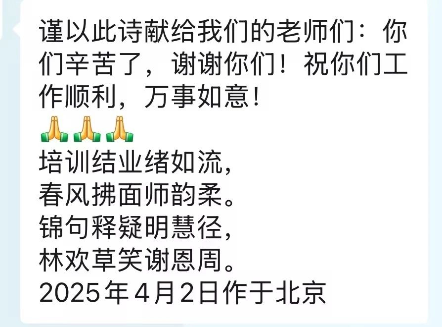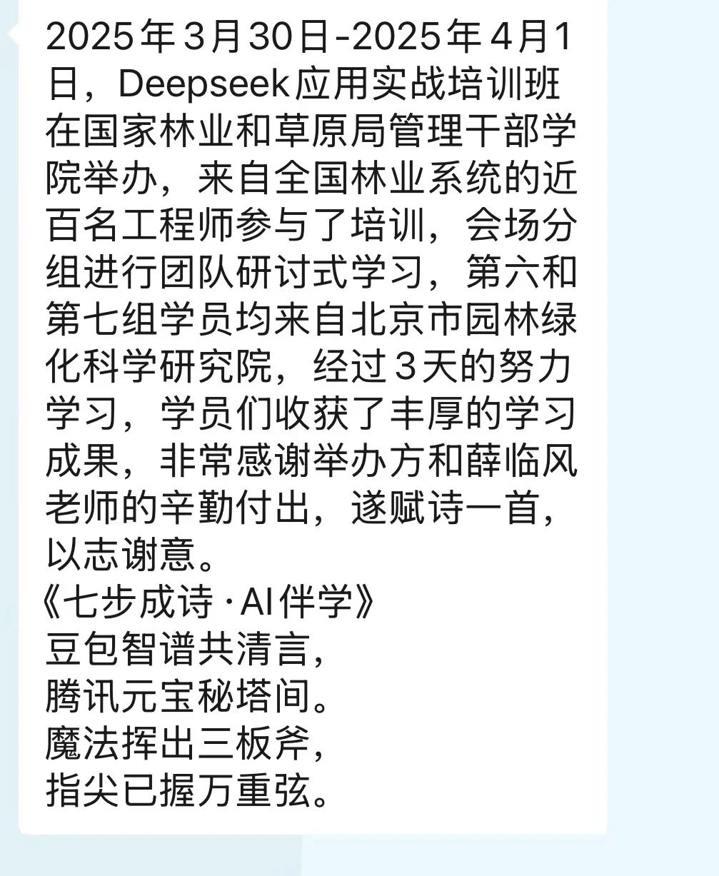 通过此次培训,学员收获颇丰,切实掌握了运用DeepSeek推理大模型技术解决实际工作问题的能力。学员们将所学AIGC技术转化为实践动能,围绕「森林防火月」主题,熟练运用 DeepSeek等工具高效产出多样化宣传图文、视频及材料;同时积极搭建业务智能体,实现工作流程的自动化与智能化升级,大幅提升工作质量和效率;更有学员活学活用创新表达,借助 AI 赋诗,向国家林业和草原局管理干部学院和授课讲师表达真挚谢意,真正实现 “学用结合” 的培训目标。